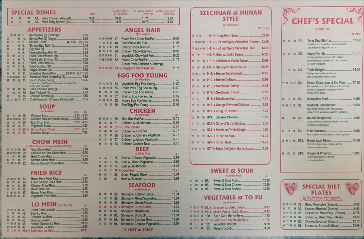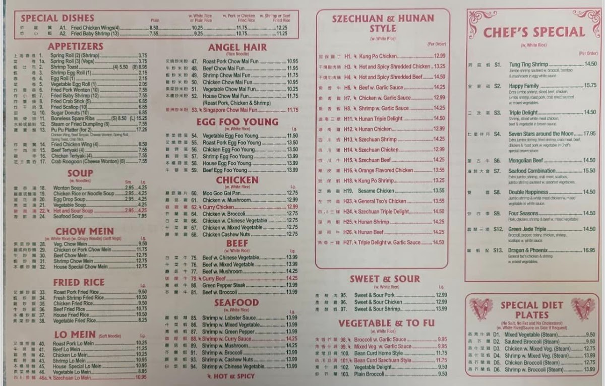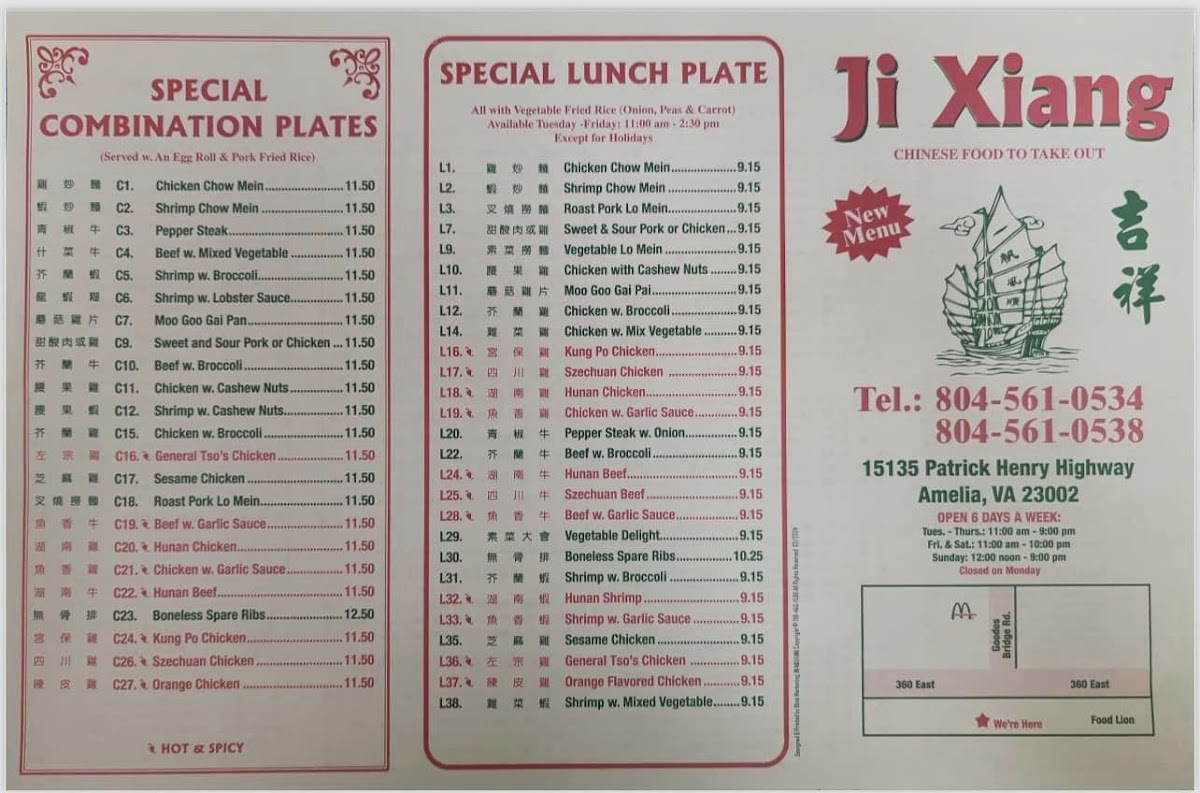 At Ji Xiang Chinese Restaurant Menu, you'll find a delightful mix of classic Chinese flavors with a few surprises along the way. Located at 15135 Patrick Henry Hwy, Amelia Court House, VA, this local gem offers everything from savory stir-fries to hearty noodle dishes, all prepared with the finest ingredients. Whether you're in the mood for something familiar like Kung Pao Chicken or craving a specialty like Szechuan Beef, there's something here to satisfy every palate. The menu also features a great selection of appetizers, perfect for sharing, and a variety of soups that warm you up from the inside out. It's the kind of place where you can enjoy a casual meal with friends or treat yourself to a comforting feast. So, next time you're in the area, swing by and dive into the flavorful world of Ji Xiang!
